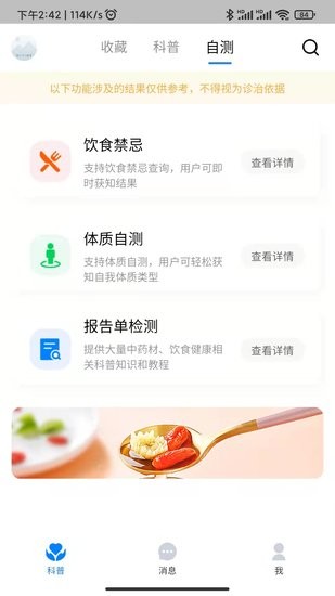 壺錄app是專注于飲食健康知識科普的服務平臺,通過此軟件大家可以了解各種食物的特性,比如生活中常吃的大蒜、生姜等等都有著詳細的介紹,平臺還提供體質自測,了解自身體質之后能夠有針對性的選擇食物,注重飲食禁忌有助于身體健康。