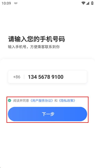 1、進入司機端注冊界面,找到手機號碼輸入框,在框內(nèi)填寫對應(yīng)的11位手機號碼,再找到協(xié)議選項并勾選。