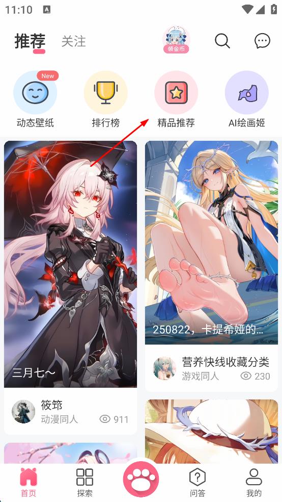 1、打開壁紙軟件,進入后在頁面上方找到選項,點擊“精品推薦”選項,進入到精品推薦頁面,瀏覽該頁面中的壁紙。