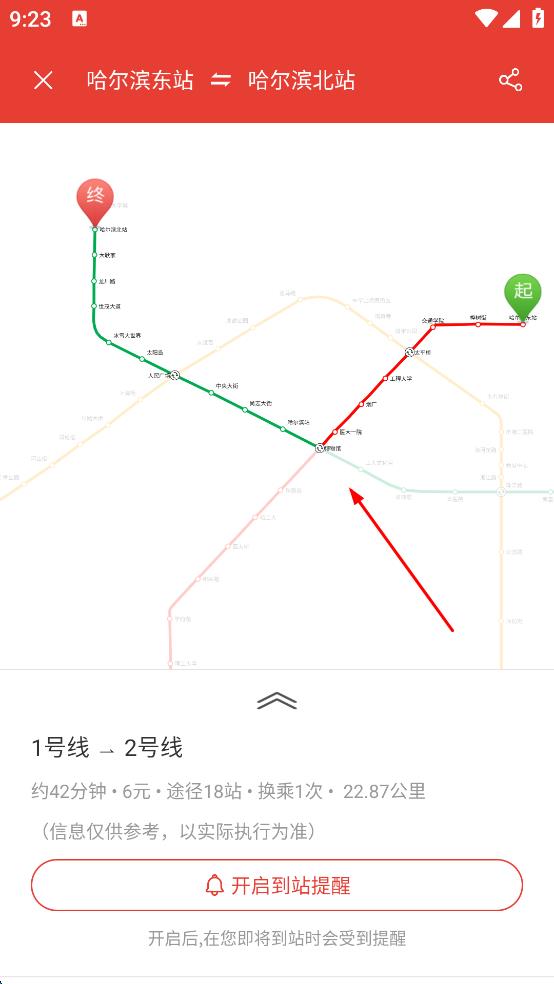 4、設(shè)置好后,軟件會(huì)自動(dòng)生成行程路線,展示出所需時(shí)間、票價(jià)、途徑站點(diǎn)數(shù)、換乘次數(shù)以及行程公里數(shù)等信息,還可點(diǎn)擊“開啟到站提醒”,以便及時(shí)知曉到站信息。