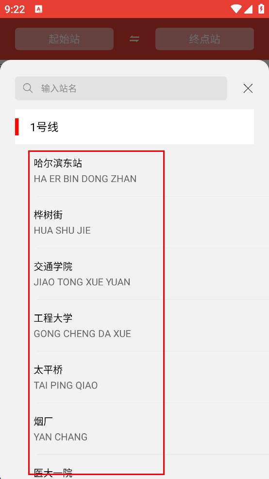 3、在“1號線”的站點(diǎn)列表里,找到并點(diǎn)擊起始站點(diǎn),接著再點(diǎn)擊“終點(diǎn)站”按鈕,同樣選擇對應(yīng)線路和站點(diǎn),完成起始站與終點(diǎn)站的設(shè)置。