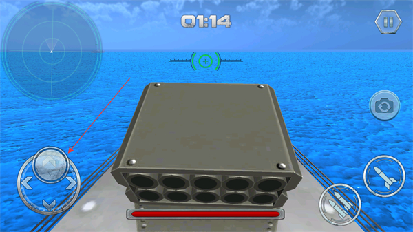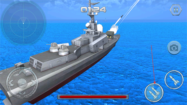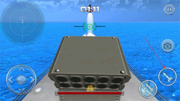 3、點(diǎn)擊右側(cè)火箭圖標(biāo)按鈕發(fā)射炮彈,可借助左側(cè)雷達(dá)輔助瞄準(zhǔn)敵方戰(zhàn)艦。