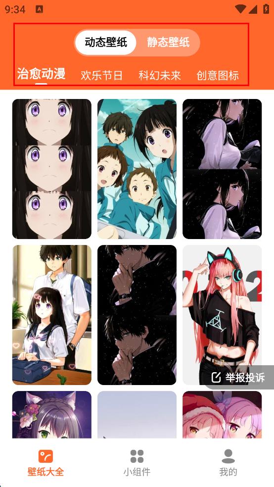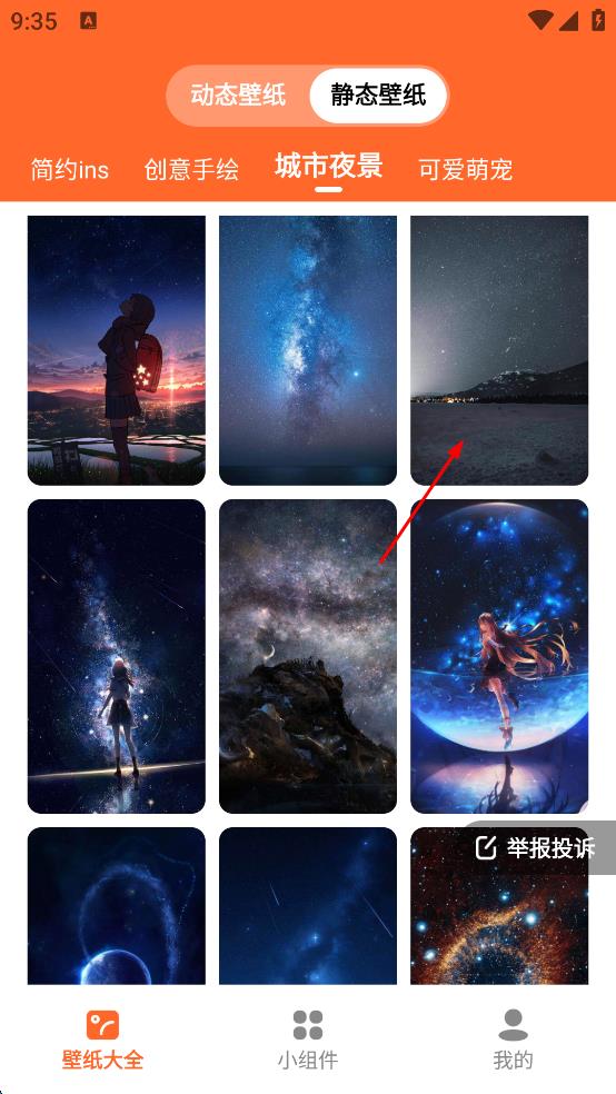 1、打開壁紙大全軟件,進(jìn)入后在頂部找到“靜態(tài)壁紙”選項(xiàng),點(diǎn)擊切換到靜態(tài)壁紙頁面,接著在下方分類里選擇需要的分類,瀏覽該分類下的壁紙。