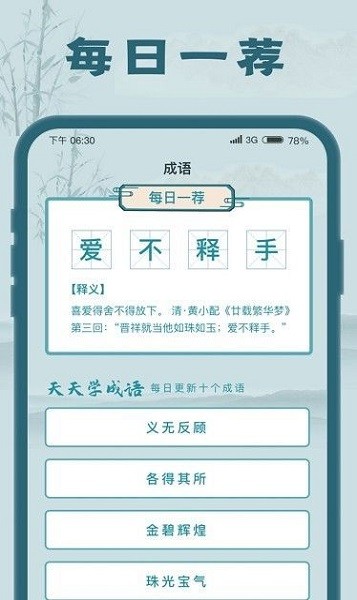 4、通過猜成語的方式來檢驗(yàn)?zāi)愠烧Z的掌握情況,每一個(gè)成語都會(huì)有非常詳細(xì)的注解