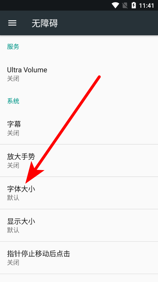 2、進入手機的無障礙設(shè)置界面,找到字體大小選項并點擊。