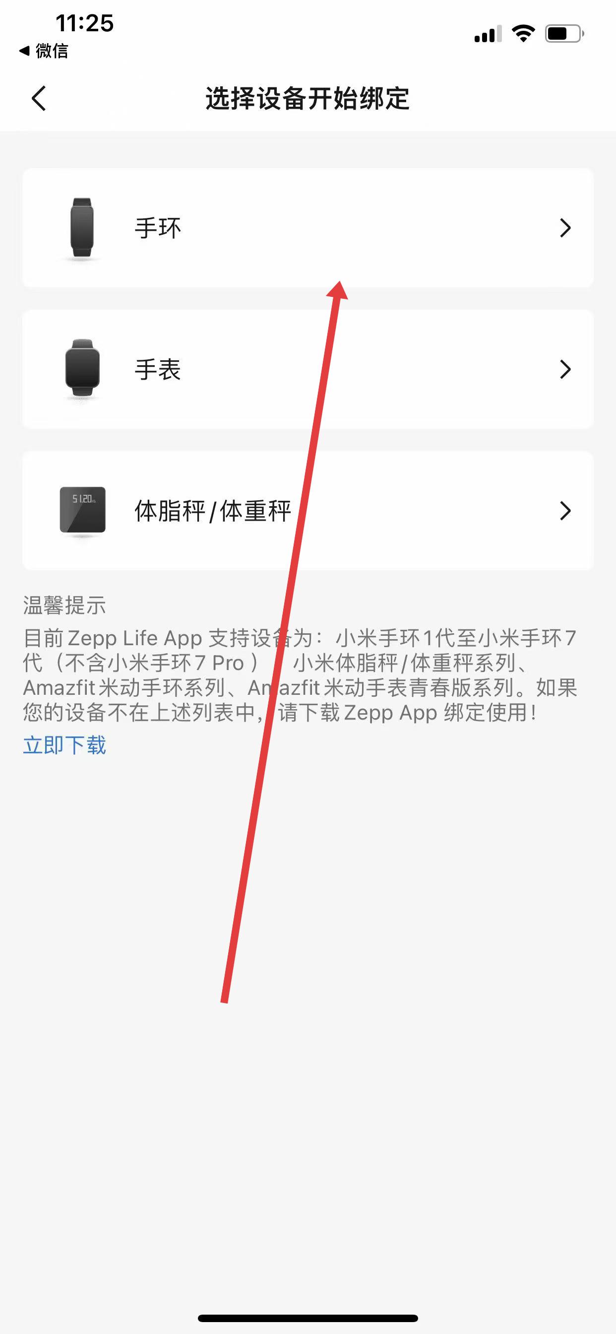 2、在設(shè)備選擇界面,點(diǎn)擊「手環(huán)」選項(xiàng),按界面提示進(jìn)入手環(huán)類(lèi)型選擇頁(yè)面。