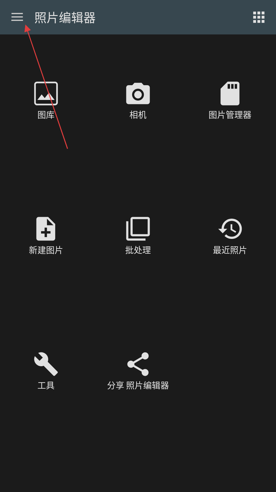 1、打開照片編輯器,點擊左上角三條橫線的菜單圖標(biāo),展開側(cè)邊欄。