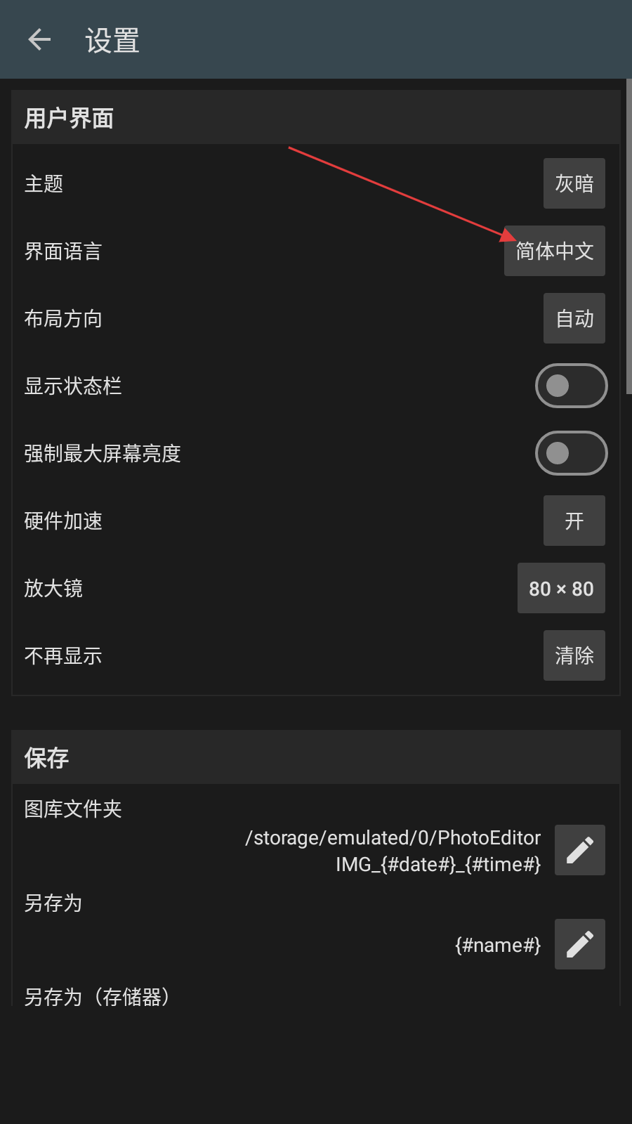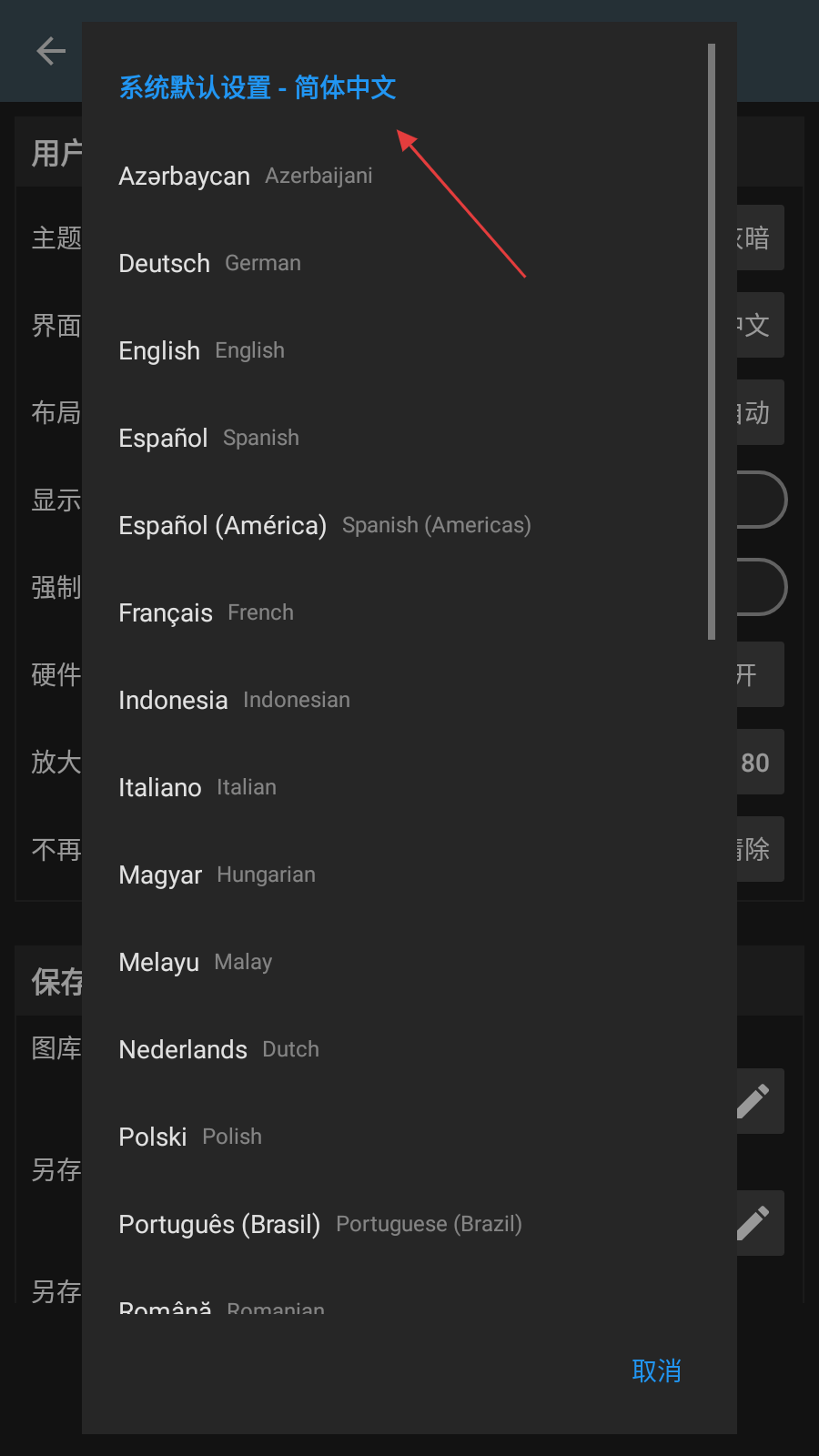 4、在彈出的語言選擇列表中,點擊目標(biāo)語言,即可完成照片編輯器界面語言的更改。