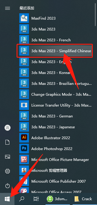 16、回到電腦桌面點(diǎn)擊左下角【開(kāi)始】圖標(biāo),點(diǎn)擊【3ds Max 2023 - Simplified Chinese】打開(kāi)軟件,也可以把這個(gè)軟件用鼠標(biāo)拖拽到桌面方便我們下次使用。