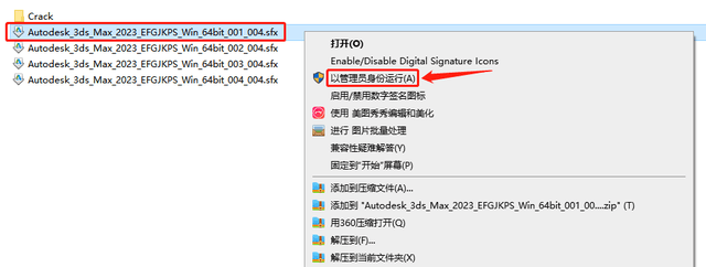 2、打開(kāi)文件夾到這個(gè)界面,鼠標(biāo)右鍵【Autodesk_3ds_Max_2023_EFGJKPS_Win_64bit_001_004.sfx】,選擇【以管理員身份運(yùn)行】。