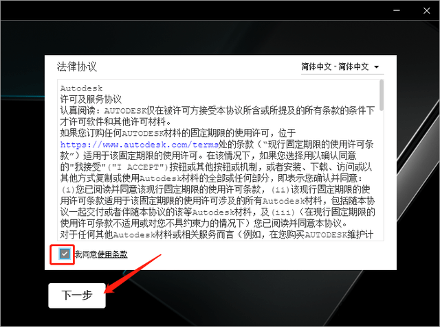 5、打勾【我同意使用條款】,再點(diǎn)擊【下一步】。