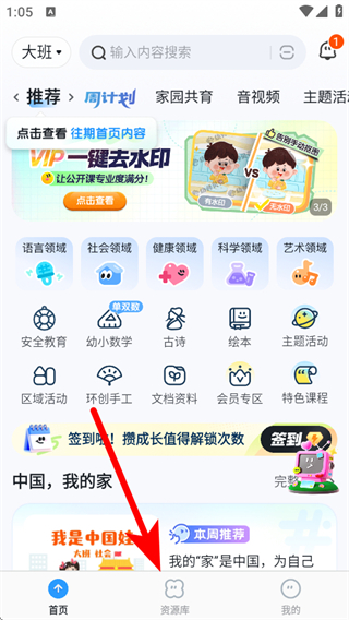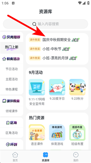 1、在幼師貝殼首頁,點(diǎn)擊底部資源庫,進(jìn)入資源庫的頁面。