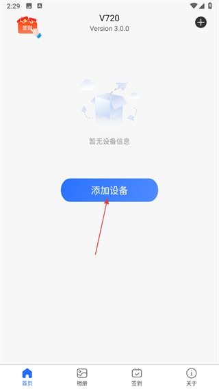 1、打開V720應(yīng)用,點(diǎn)擊界面中間添加設(shè)備按鈕。