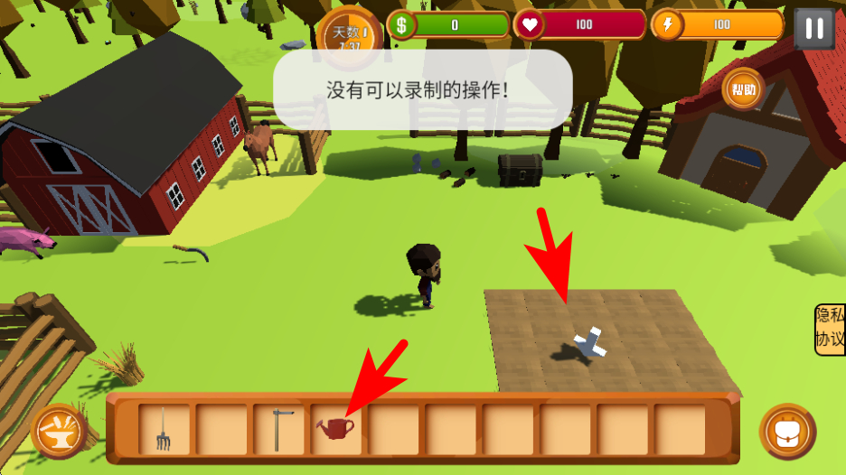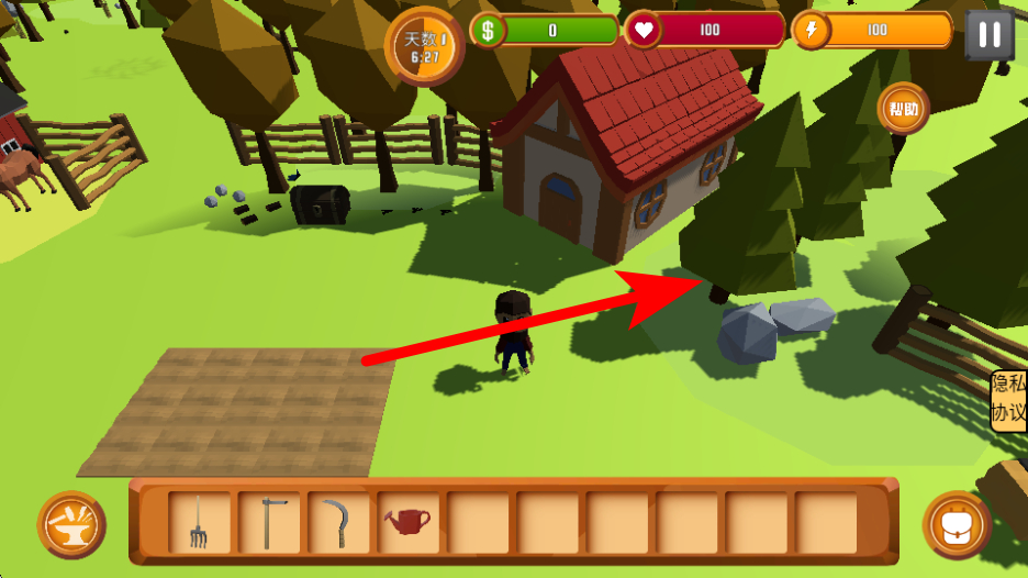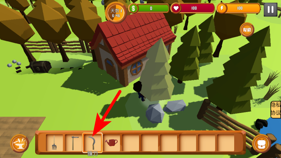 3、根據(jù)物品類型,選擇對應的工具如鐮刀、水壺等進行操作,例如用鐮刀割草,用水壺澆灌。