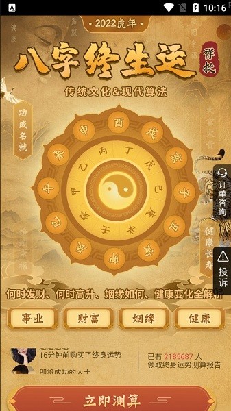 八字終身運最新版可以幫助你看到不同方面的運勢,包含了生活的方方面面,專業(yè)數(shù)據(jù)分析為你保駕護航,不管是想檢測事業(yè)、財富、姻緣還是健康等,都可以借助該軟件來幫助你,感興趣的用戶不妨來了解更多吧!