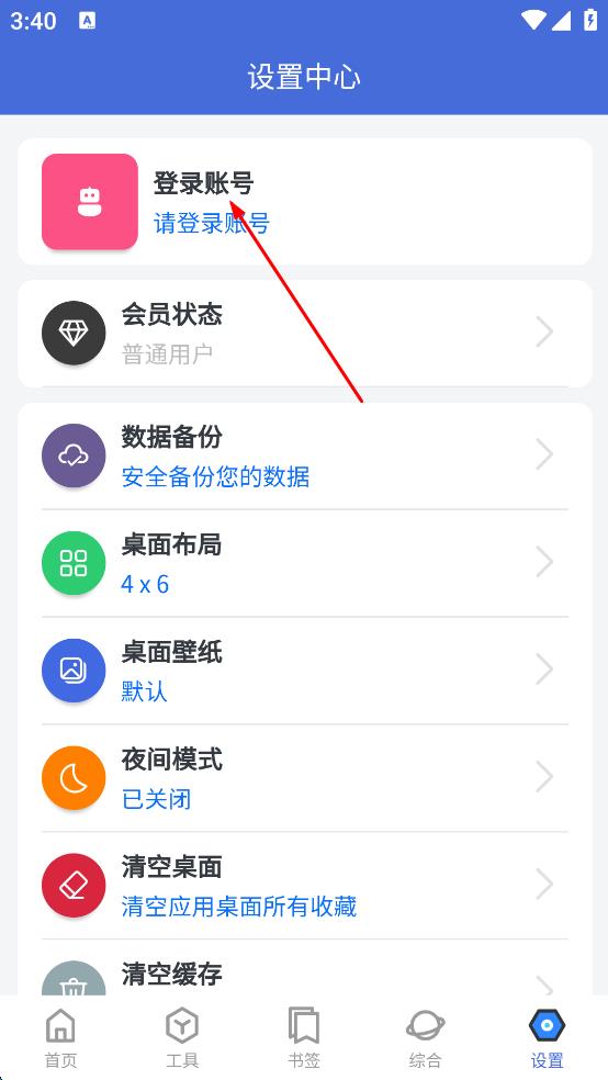 2、在設(shè)置中心,點擊“登錄賬號”。