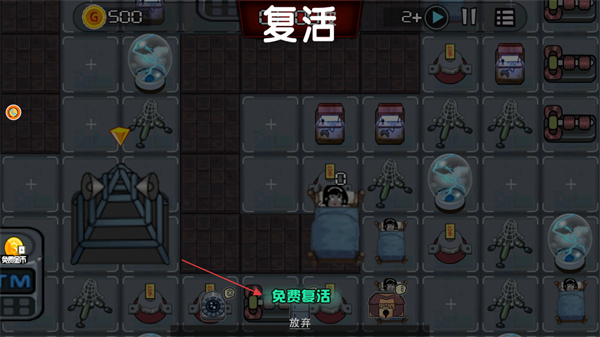 4、角色失敗后,會彈出復活界面,可選擇免費復活繼續(xù)游戲,也可點擊放棄重新開始挑戰(zhàn)。