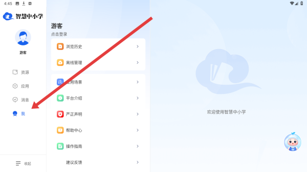1、在智慧中小學(xué)平臺界面,點(diǎn)擊左側(cè)導(dǎo)航欄的我,進(jìn)入個(gè)人中心頁面,查看游客狀態(tài)下的功能列表。