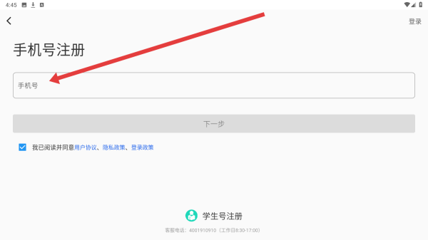 3、在手機(jī)號注冊頁面,輸入手機(jī)號碼,勾選用戶協(xié)議、隱私政策及登錄政策,激活下一步按鈕準(zhǔn)備注冊。