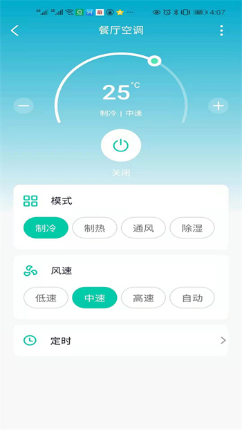 在應(yīng)用中就能對(duì)空調(diào)進(jìn)行控制,可自行選擇模式和風(fēng)速級(jí)別;