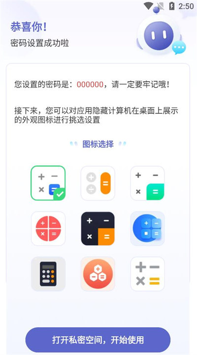 3、搞定密碼之后,在界面中,選擇應(yīng)用的樣式,有多個計算器的圖標可以選擇;