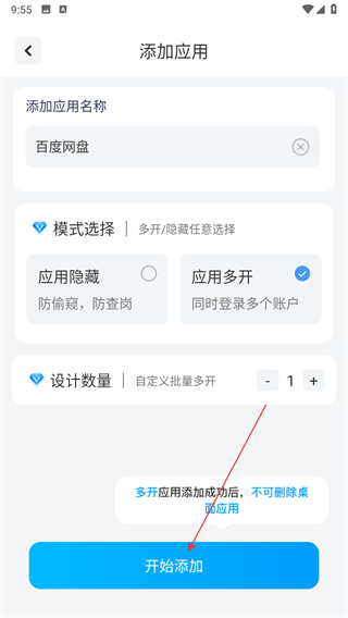 3、確認應(yīng)用名稱,選擇應(yīng)用多開模式,點擊開始添加。