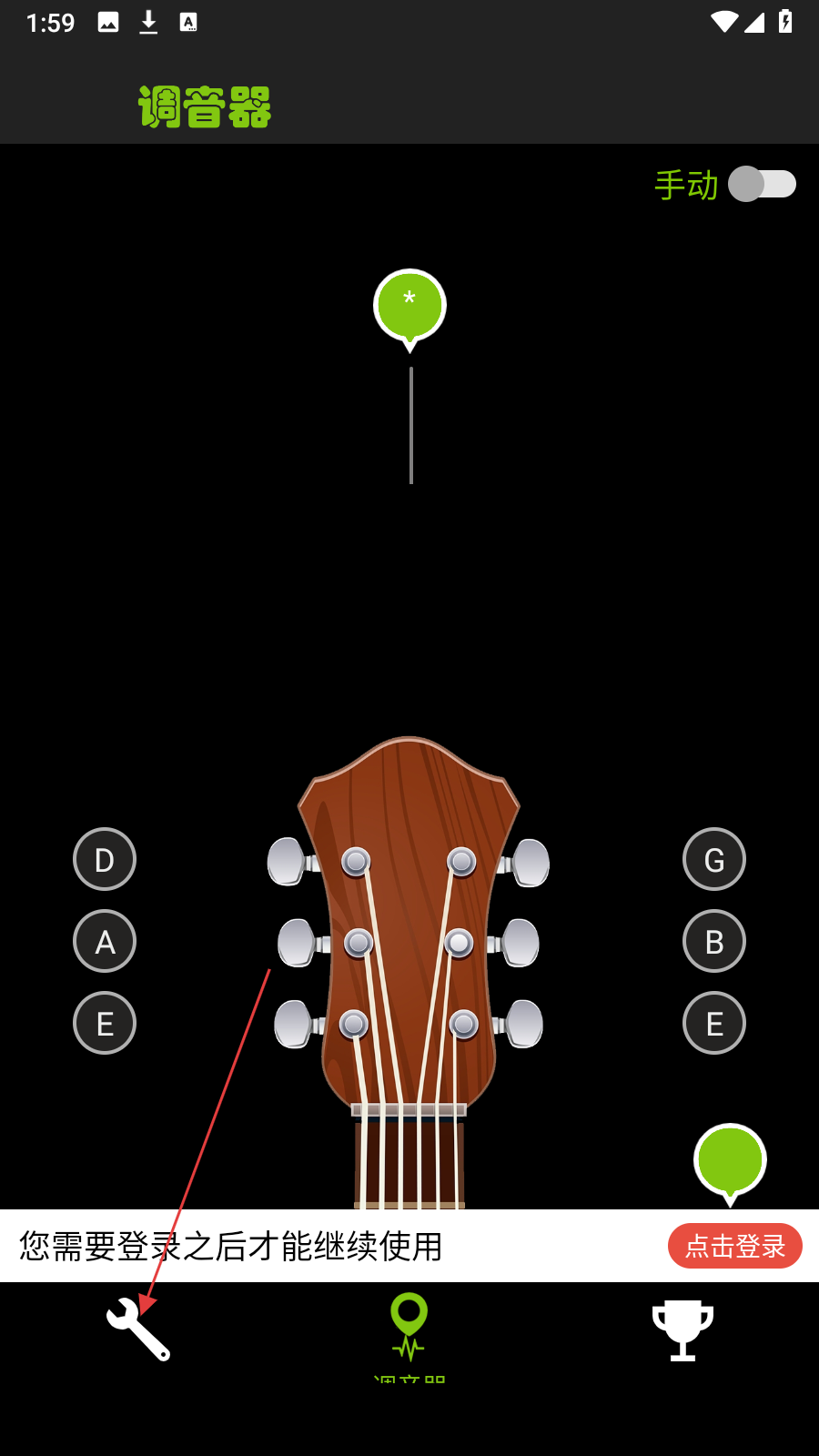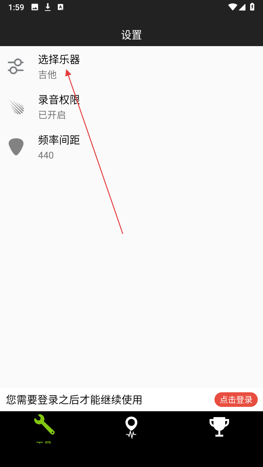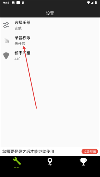 1、打開GuitarTuner應(yīng)用,點(diǎn)擊左下角扳手形狀的工具按鈕,進(jìn)入設(shè)置頁面。