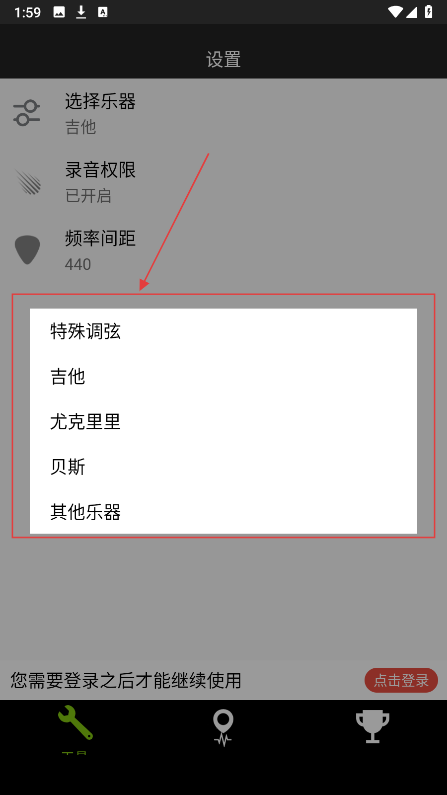 2、在設(shè)置的頁面中,點(diǎn)擊選擇樂器的選項(xiàng)。