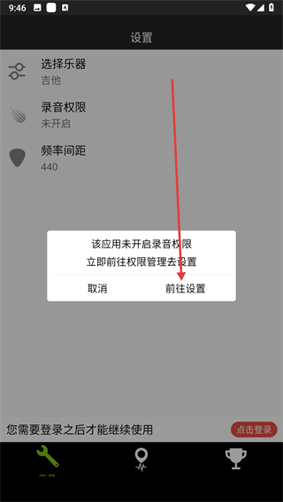 2、在設(shè)置頁面點(diǎn)擊錄音權(quán)限選項(xiàng),彈出權(quán)限設(shè)置提示框。