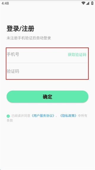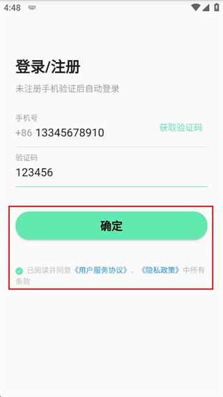 3、勾選已閱讀并同意用戶服務(wù)協(xié)議和隱私政策后點(diǎn)擊“確定”按鈕,完成登錄/注冊(cè)操作。