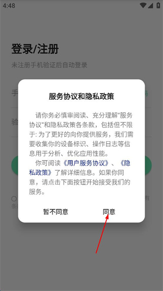 1、在服務(wù)協(xié)議和隱私政策窗口,點(diǎn)擊“同意”按鈕,進(jìn)入登錄/注冊(cè)界面。