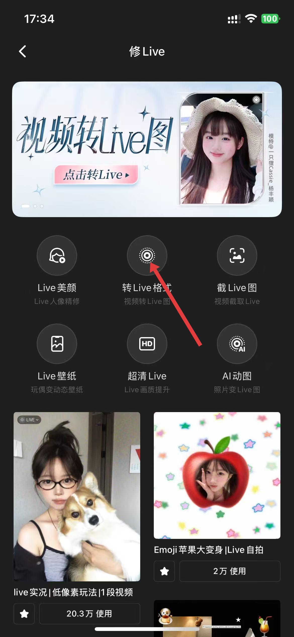 2、點擊轉(zhuǎn)Live格式選項,從相冊中選擇你想要處理的Live圖或視頻。
