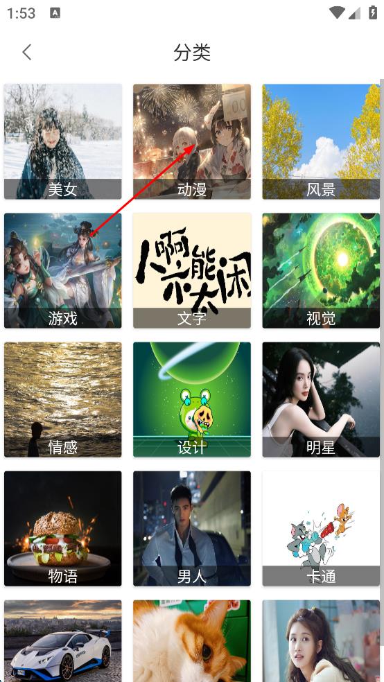 1、進(jìn)入壁紙軟件分類頁(yè)面,找到自己感興趣喜歡的分類并點(diǎn)擊,進(jìn)入壁紙列表。