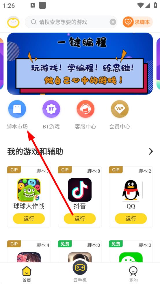 1、打開(kāi)鳥(niǎo)人助手應(yīng)用,在首頁(yè)點(diǎn)擊腳本市場(chǎng)圖標(biāo),進(jìn)入腳本市場(chǎng)界面。