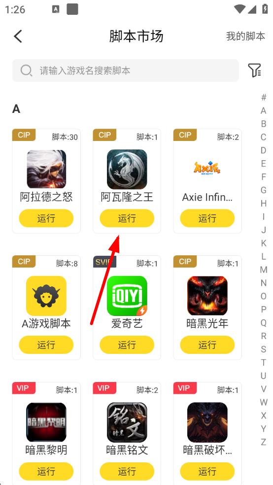 2、在腳本市場(chǎng)中,通過(guò)搜索或?yàn)g覽找到你想使用的游戲腳本,比如找到阿瓦隆之王的腳本,點(diǎn)擊運(yùn)行按鈕。