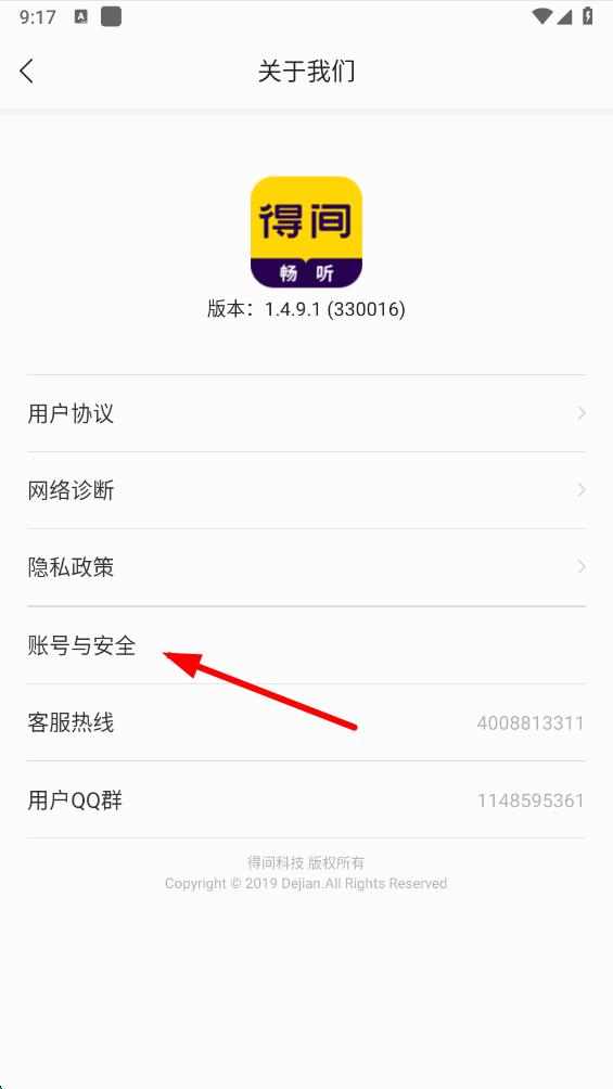4、在關(guān)于我們頁面,點擊賬號與安全進入賬號安全管理頁面。