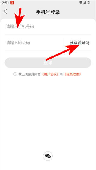 3、在手機號登錄頁面,輸入手機號碼,點擊獲取驗證碼,輸入收到的驗證碼。