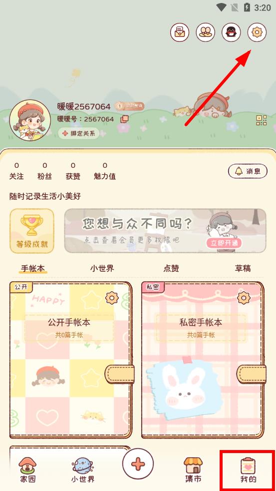 1、打開暖暖手帳APP,點(diǎn)擊底部導(dǎo)航欄中的我的選項(xiàng),進(jìn)入個(gè)人頁(yè)面,點(diǎn)擊右上角的設(shè)置圖標(biāo),進(jìn)入設(shè)置中心。