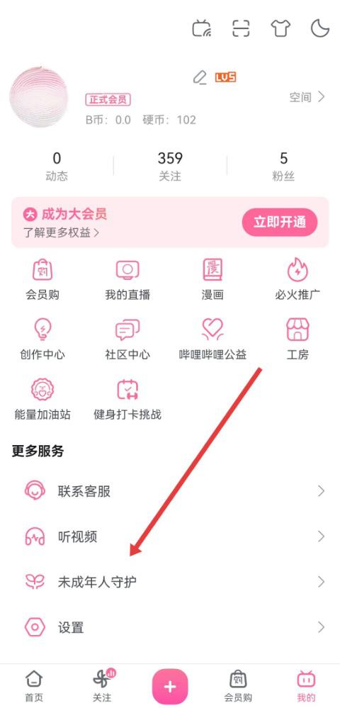 1、打開嗶哩嗶哩APP,進入我的頁面,找到并點擊未成年人守護的選項,進入未成年人守護設(shè)置界面。