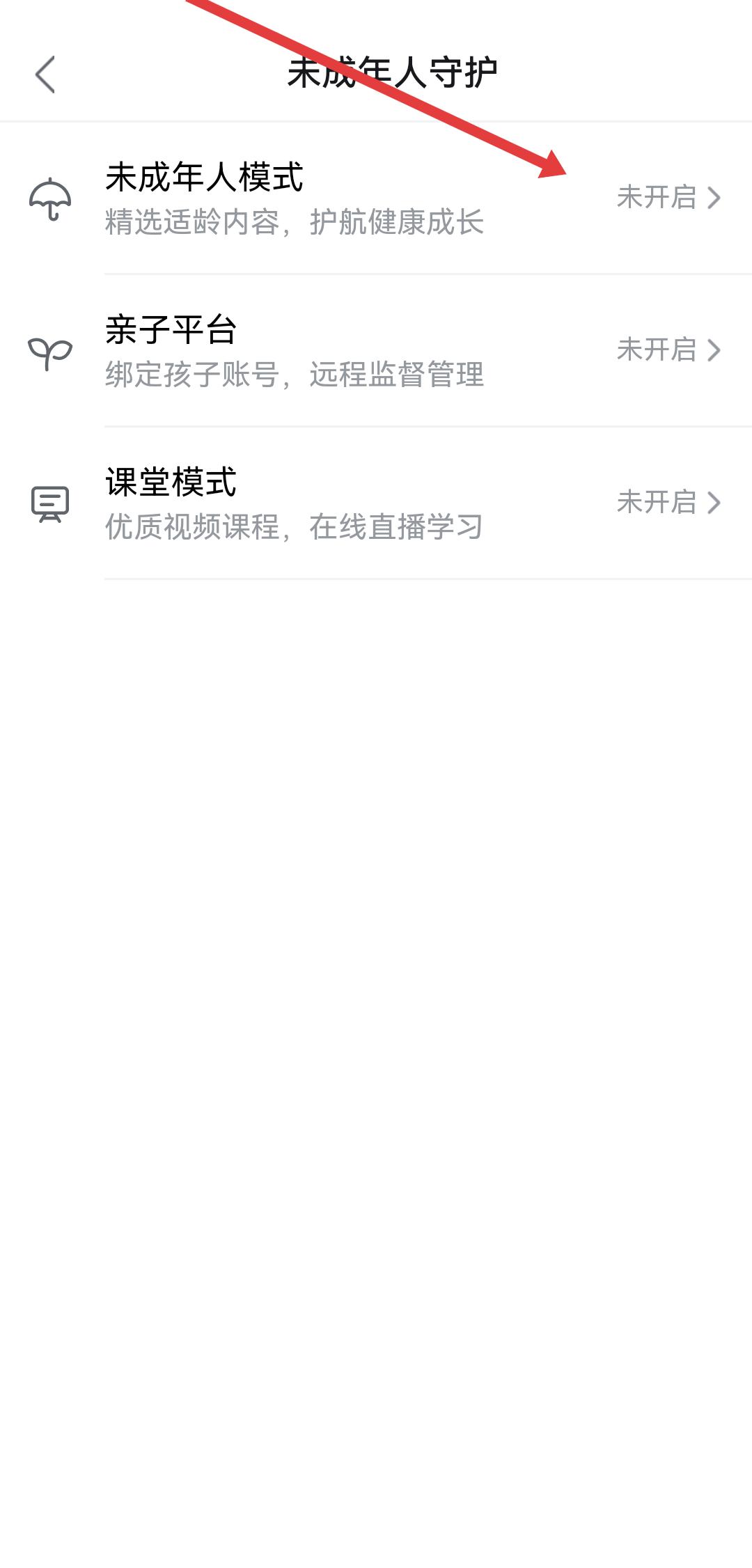 2、在未成年人守護的頁面中,點擊未成年人模式選項,顯示未開啟狀態(tài),進入模式開啟準備頁面。