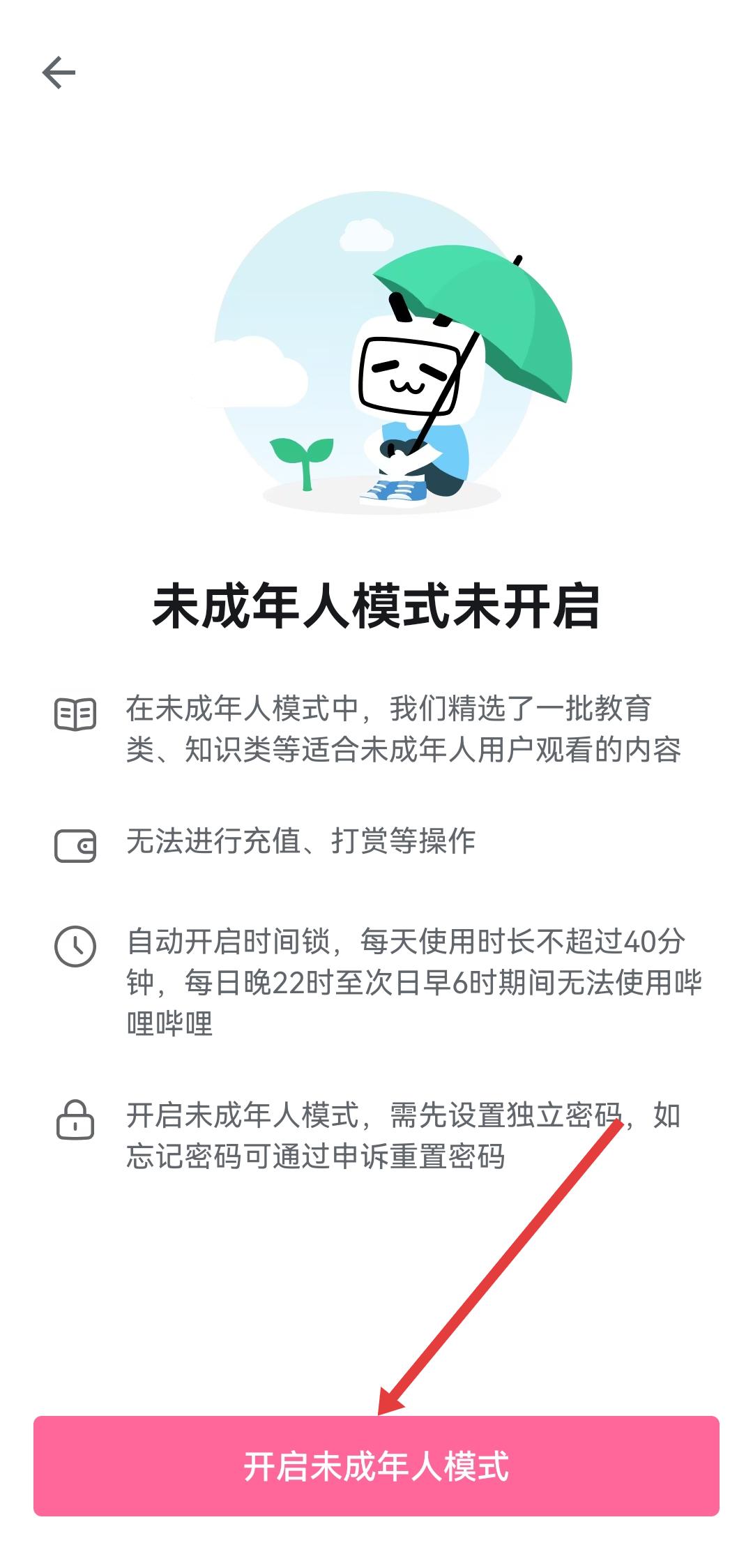 3、在未成年人模式未開啟頁面,點擊下方的開啟未成年人模式按鈕,隨后按照提示設(shè)置獨立密碼。