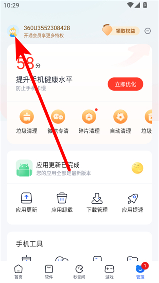 1、打開360手機(jī)助手APP,點(diǎn)擊底部導(dǎo)航欄的管理選項(xiàng),進(jìn)入管理頁(yè)面。