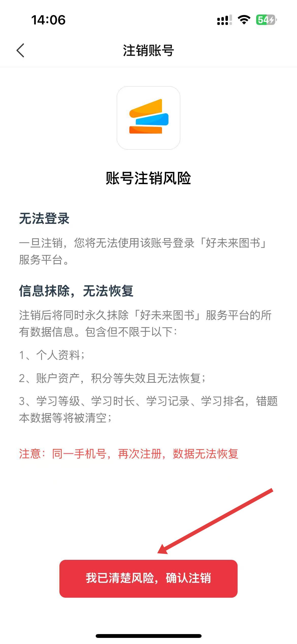 5、仔細閱讀賬號注銷風險說明后,點擊我已清楚風險確認注銷,完成賬號注銷。