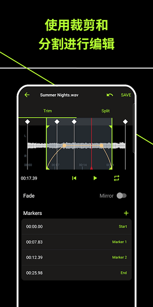 使用修剪或拆分選項(包括可調(diào)節(jié)淡出曲線和標(biāo)記)編輯錄制文件