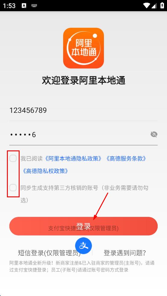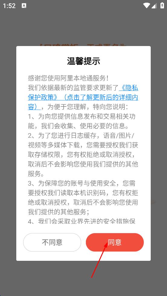 1、打開阿里本地通APP,在“溫馨提示”彈窗中,點(diǎn)擊“同意”,進(jìn)入登錄選擇頁(yè)面。