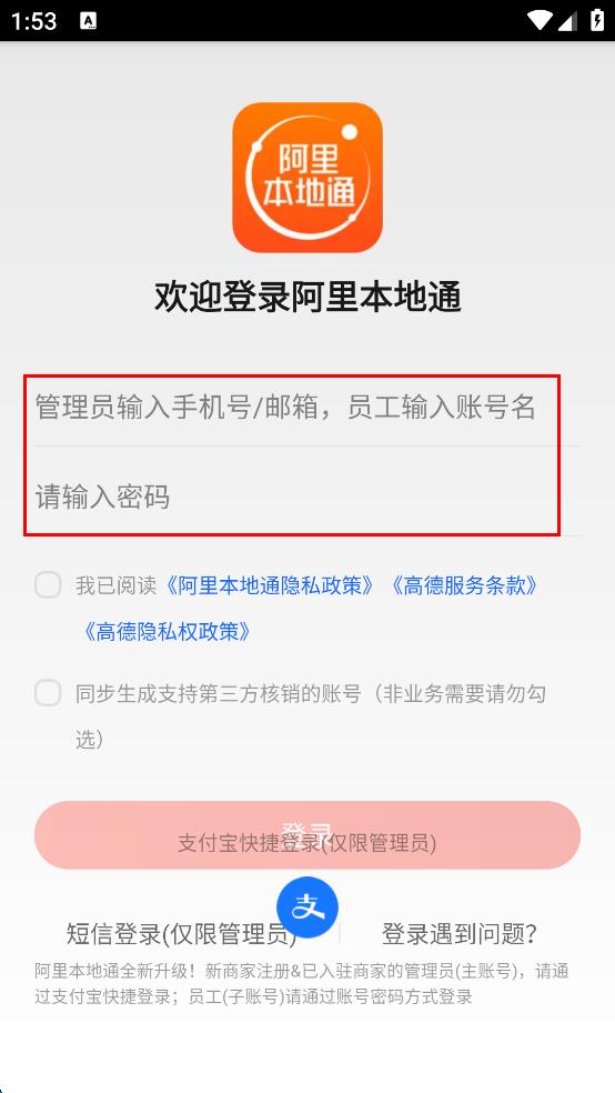 3、在賬號(hào)密碼登錄界面,管理員輸入手機(jī)號(hào)或郵箱,員工輸入賬號(hào)名,然后輸入登錄密碼。