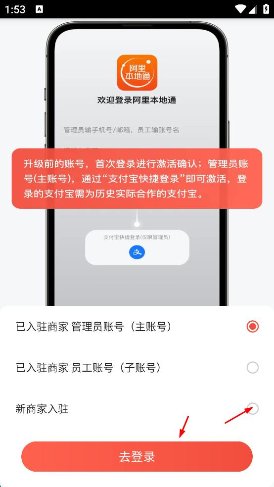 2、在登錄選擇頁(yè)面,選擇賬號(hào)類型,比如“新商家入駐”,點(diǎn)擊“去登錄”,進(jìn)入賬號(hào)密碼登錄界面。