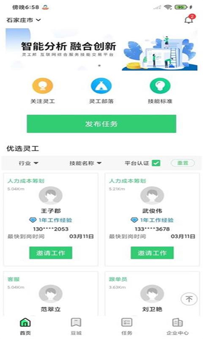 靈工邦是為企業(yè)、個人提供一站式互聯(lián)網(wǎng)眾包服務(wù)的綜合應(yīng)用平臺。通過平臺企業(yè)能夠隨時隨地發(fā)布多種類型的工作任務(wù),根據(jù)職業(yè)類別為自由職業(yè)者精準(zhǔn)匹配適合的工作任務(wù),實現(xiàn)任務(wù)執(zhí)行過程和結(jié)果在線監(jiān)管、靈活用工多元化,幫助企業(yè)增效降本,為個人賦能創(chuàng)收,打造全新的靈活用工模式。