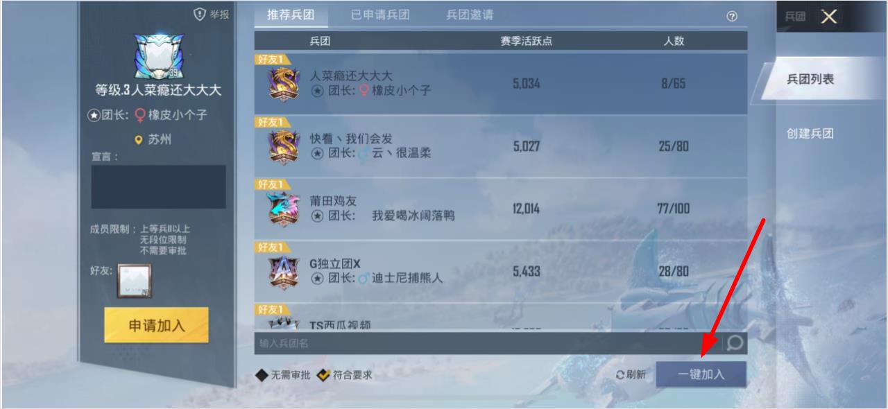2、進(jìn)入兵團(tuán)界面后,在推薦兵團(tuán)列表中,點(diǎn)擊一鍵加入按鈕。
