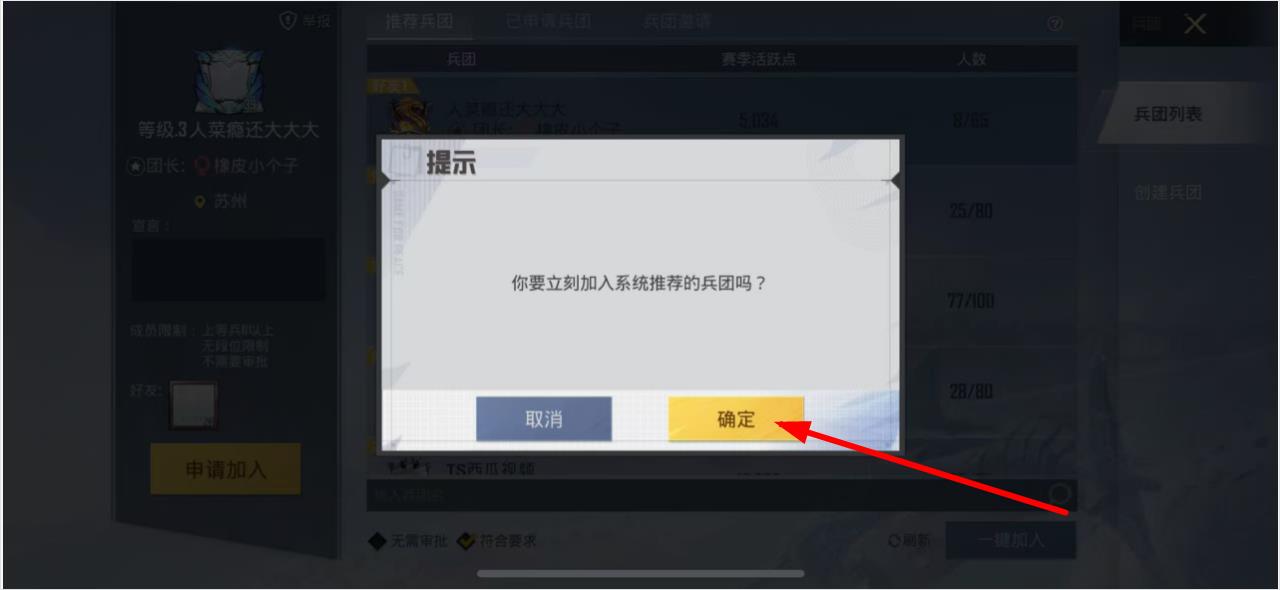 3、在彈出的提示框中,點(diǎn)擊確定即可加入系統(tǒng)推薦的兵團(tuán)。